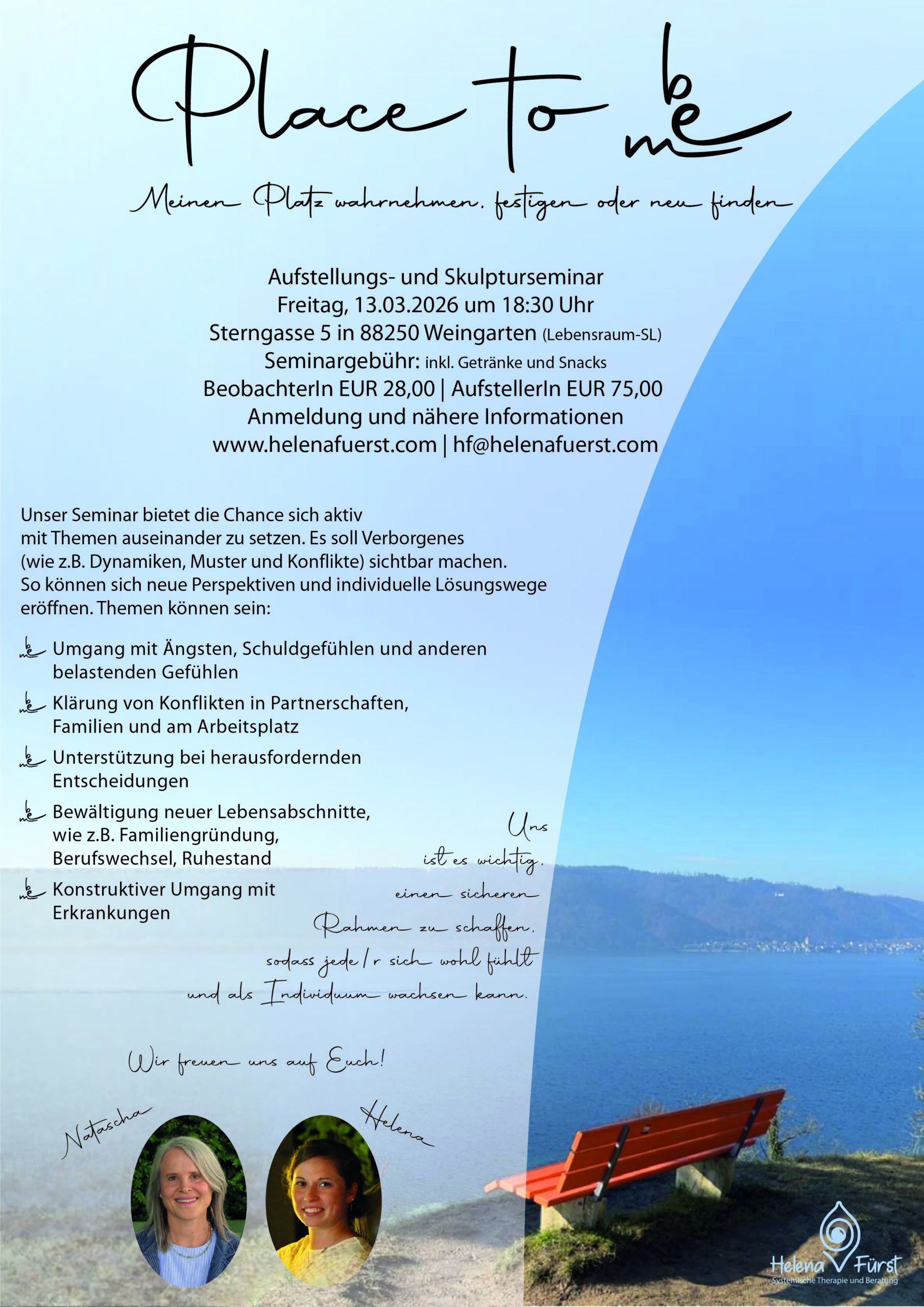 Place to be me – „Ich zu sein“ bedeutet für mich ein lebenslanger Prozess – bewusst spüren, wahrnehmen und mich immer wieder neu ausloten. Begegnungen auf Augenhöhe machen meine Arbeit zu dem, was sie ist und überhaupt erst hilfreich. Da Themen teilweise schwer wiegen, ist ein sensibler Umgang für mich sehr wichtig – mit einer Prise Humor am richtigen Platz. “
